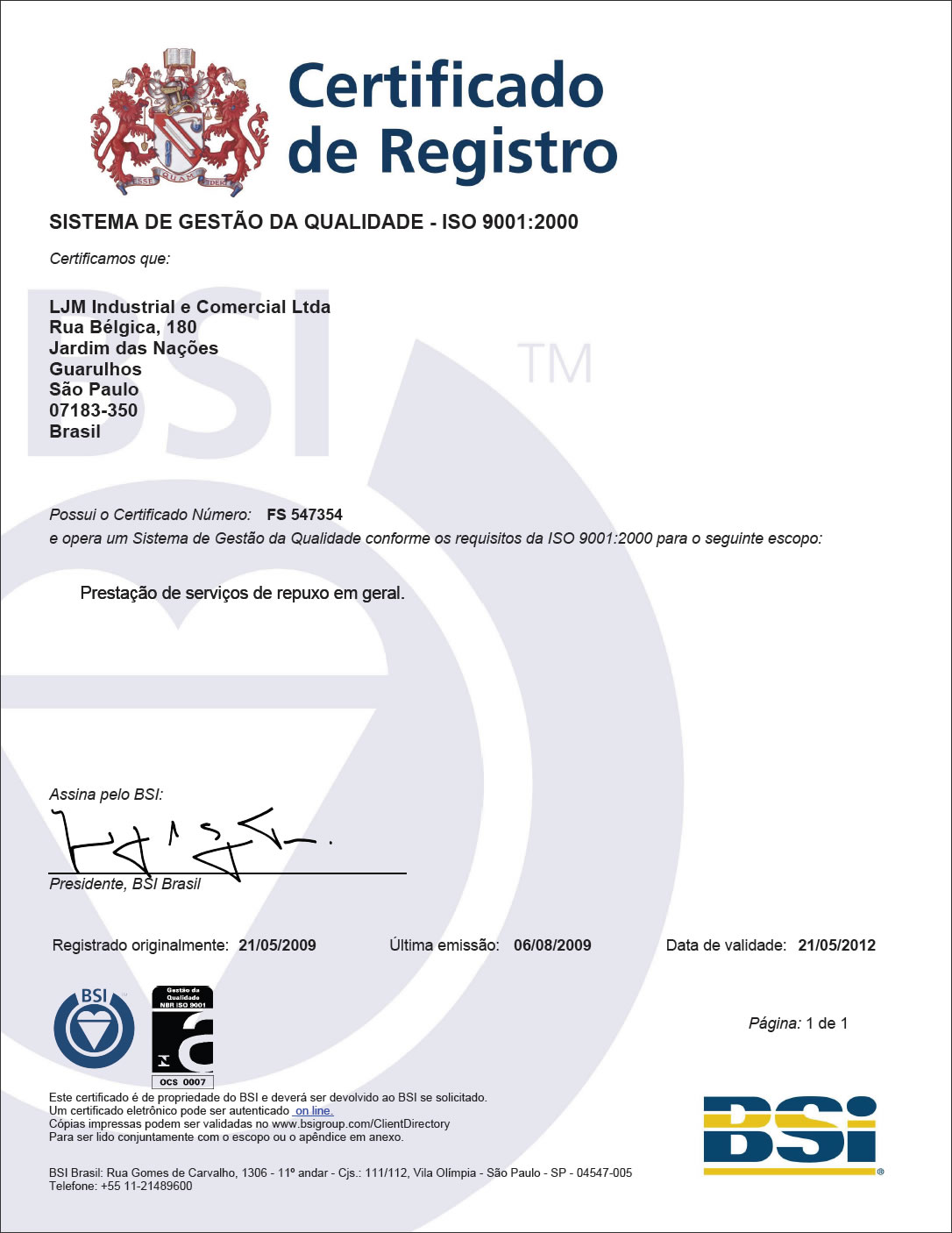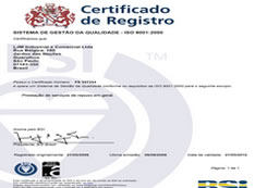 Nossa certificação, em maio de 2009, garante nossa qualidade sob os requisitos da norma NBR ISO 9001:2000, para a Prestação de Serviços de Repuxo em Geral e peças estampadas.